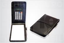 Calculadora com bloco de anotações de couro sintético preto com mini caneta de plástico. Bloquinho com 30 folhas. Medidas: 15,5 cm x 10,5 cm x 30,5 cm
