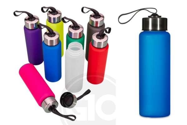 Garrafa plástica de 680ml. Produzido em PVC fosco livre de BPA, a squeeze possui tampa rosqueável em inox com alça elástica para transporte (não removível). Personalização em 1 cor já incluso.