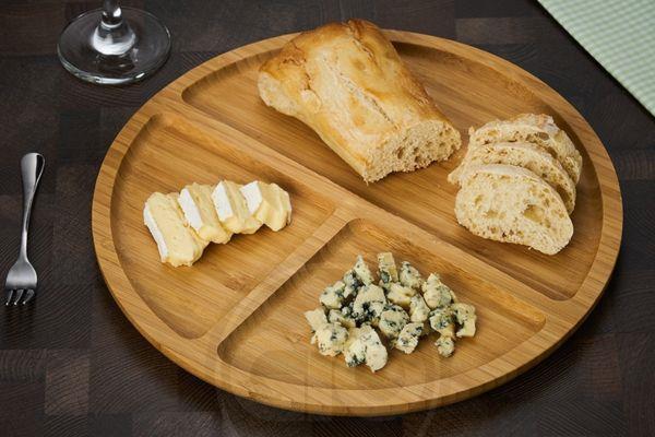 Petisqueira de bambu grande com 3 divisórias. Medidas: Largura: 30cm x Espessura: 1,6cm x Comprimento: 30cm. Personalização inclusa.