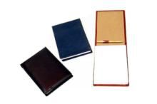Porta-bloco requinte, Finíssimo porta-bloco revestido em couro sintético, totalmente forrado em camurça. Contém porta-caneta e, opcionalmente, porta-cartões. Disponível nas cores preta, marrom cognac, whisky, azul, verde, vermelha, cinza, bege, mostarda ou prata. Outras cores sob consulta. Personalização em baixo relevo e/ou silk screen.